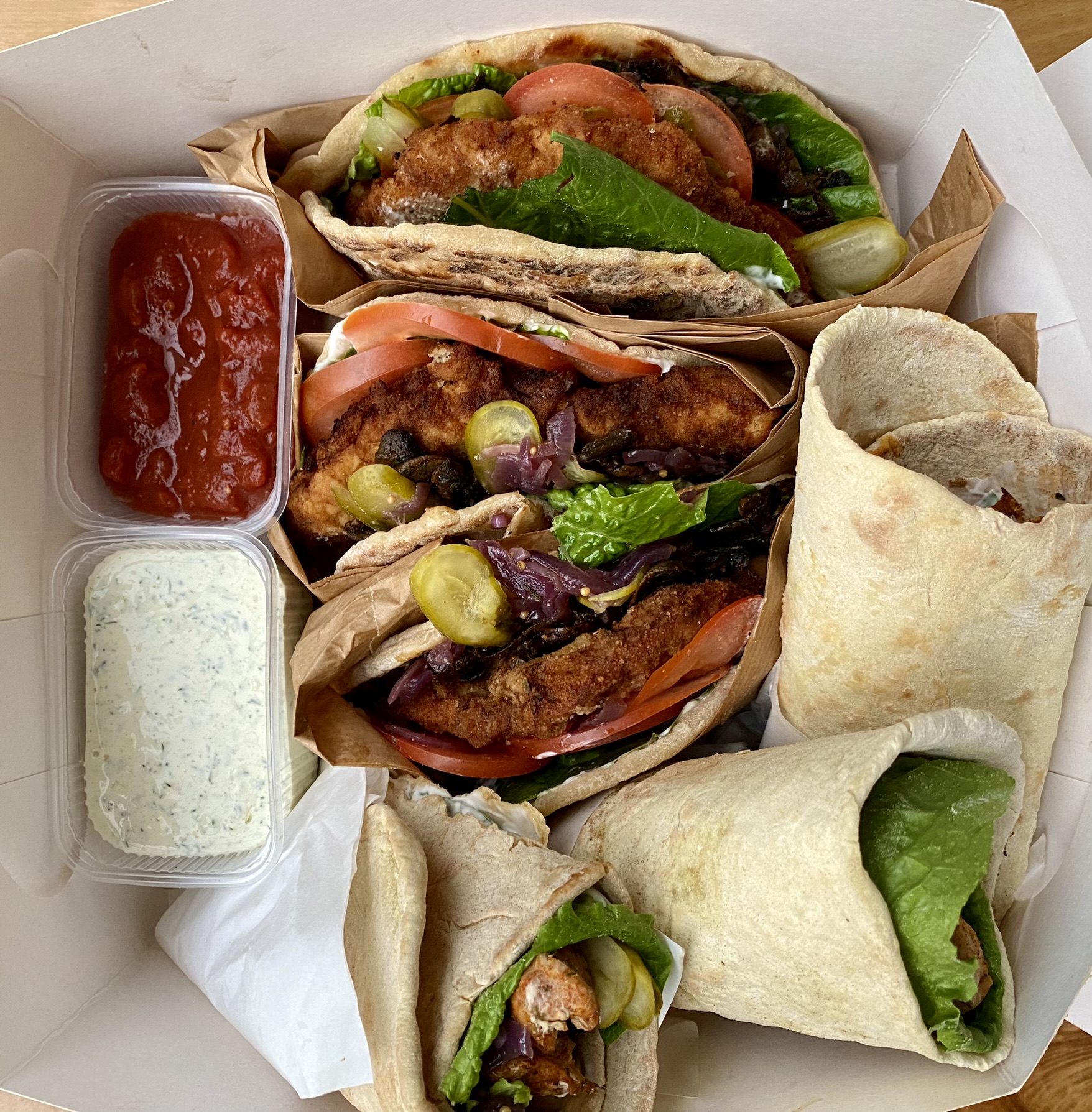 3 x pita z kotletem schabowym, sałatą rzymską, sosem serowym, ogórkiem konserwowym, pieczarkami i karmelizowana czerwoną cebulą